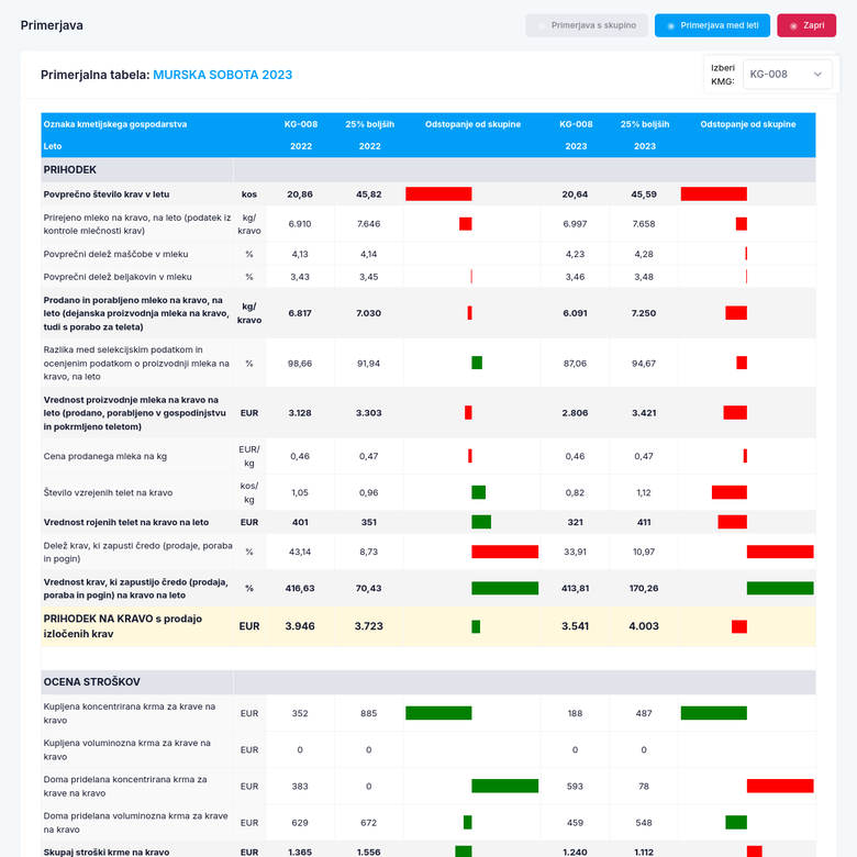 BENCHMARK PLATFORM is used by farmers and agricultural advisors to analyse, compare and advice on economic indicators about various aspects of the farm production efficiency and economy (e.g.: economic indicators of dairy production). The Benchmark platform uses advanced analytical tools, based on modern business intelligence technologies and artificial intelligence tools, allowing farmers and agricultural advisors to gain new insights about production and various farming practices, by benchmarking the production data within the Study Groups, or analysing individual production and economy indicators through consecutive years.